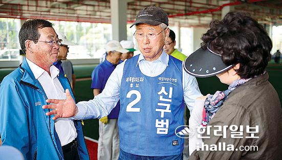 새정치민주연합 신구범 후보가 29일 농협 원로 게이트볼대회가 열린 제주종합경기장 게이트볼장을 찾아 참가자들과 이야기를 나누고 있다. 사진=강희만기자