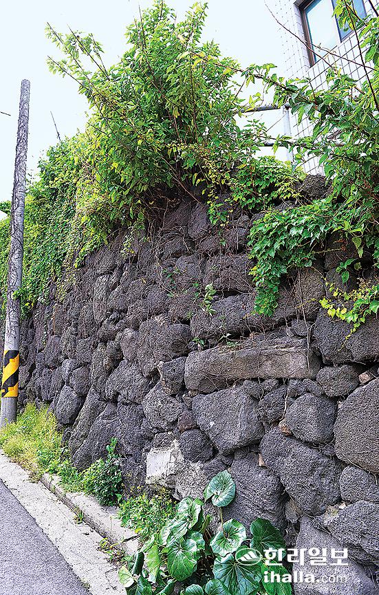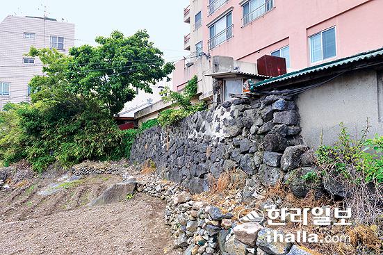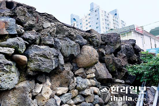 제주시 남성로 25길 일대. 남쪽으로는 몇 년 전 들어선 삼도쉐르빌아파트가 괴물처럼 버티고 섰다. 이 일대는 제주성 남성과 남문지 일대에 인접한 구간이다. 이로 인해 제주성과 원도심의 역사문화경관을 고려하지 않은 무분별한 개발행위라는 지적이 끊임없이 제기되고 있는 곳이기도 하다. 지속적으로 개발행위가 이뤄지면서 성곽 흔적은 쉽게 눈에 띠지 않는다. 그런데 자세히 보면 가정집 주택 하단부에 성담 기단부가 남아있는 것을 볼 수 있다.