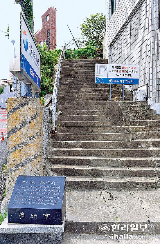 제주성 동성 위에 만든 제주기상청 진입 계단. 지금은 폐쇄돼있다. 강희만기자