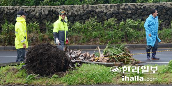 ▲9일 오전 제주 전역에 태풍경보가 발효된 가운데 서귀포시 하원동 도로에 심어져 있던 야자수가 강한 바람을 견디지 못해 뿌리째 뽑히는 등 곳곳에서 바람 피해가 발생하고 있다. 사진=독자 제공
