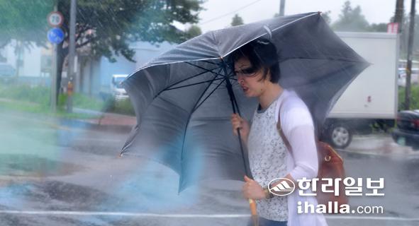 ▲9일 오전 강한 비바람을 뚫고 출근하는 도민. 강희만기자