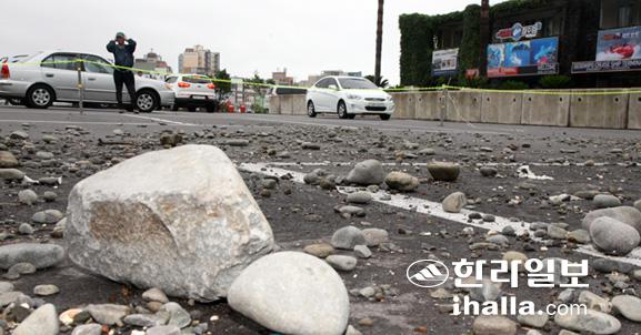 ▲9일 제주 서귀포시 새연교와 서귀포층패류화석지 사이 주차장이 제8호 태풍 너구리의 영향으로 거세진 바람과 파도에 떠밀려온 돌들로 통제됐다. 사진=연합뉴스