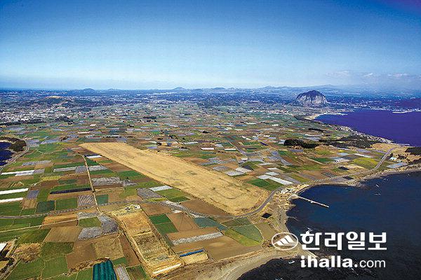하늘에서 본 알뜨르비행장. 앞쪽으로 활주로가, 오른쪽 뒤로 산방산이 보인다. 이 비행장은 일제가 중국대륙 침략을 위해 1930년대 초부터 조성했다.