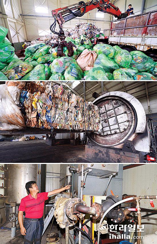서광산업 관계자가 공장에 반입된 필름류 쓰레기를 압축하기 위해 기계로 들어올리고 있다. 재생연료를 생산하기 위해 압축된 필름류를 기계속으로 넣고 있다. 김상택 본부장이 정제유 기름탱크 수위를 체크하고 있다.(사진 위부터) 강희만기자