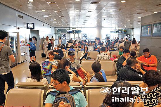 중국 상하이 푸둥공항에서 제주로 출발하는 비행기를 타기 위해 대기중인 중국인 관광객들.