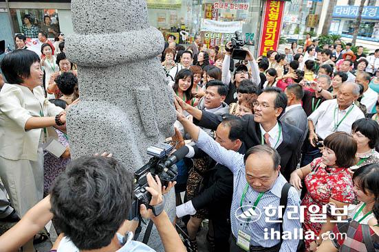 중국인 관광객들이 2011년 9월 제주시 연동 바오젠거리 개장식에서 돌하르방을 만지며 즐거워하고 있다.