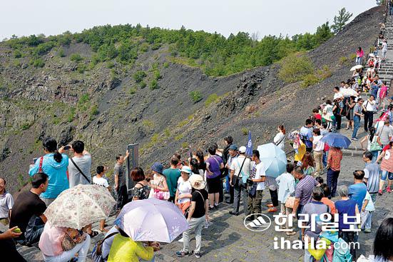 우다롄츠 세계지질공원 내 화산분화구를 찾은 관광객들. 강경민차장