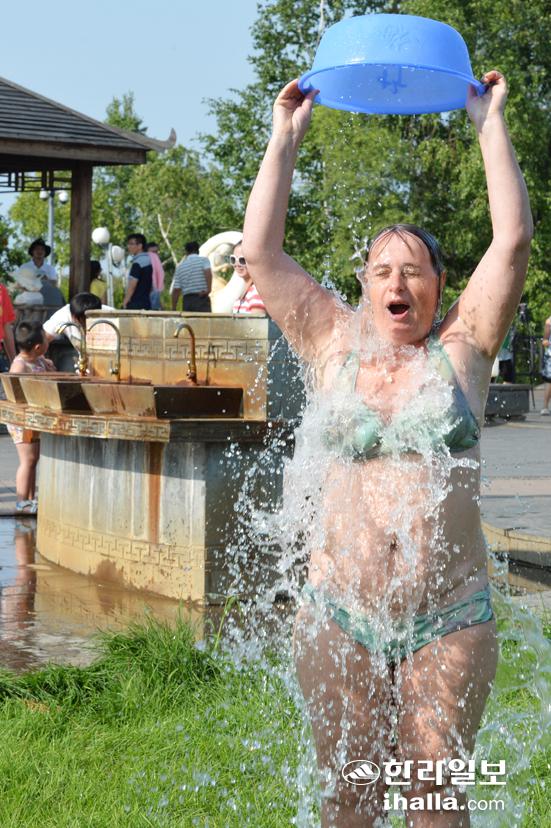 우다롄츠의 세계명천에서 한 러시아인 관광객이 탄산가스가 함유된 천연광천수로 샤워를 하고 있다.