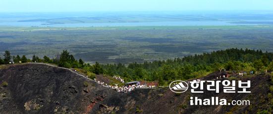 유네스코 생물권보전지역이자 세계지질공원으로 지정된 우다롄츠는 다양한 화산지형이 잘 보존돼 있어 화산박물관이라 불린다. 우다롄츠의 라오헤이산 정상부 너머로 드넓은 호수가 펼쳐져 있다. 강경민 차장