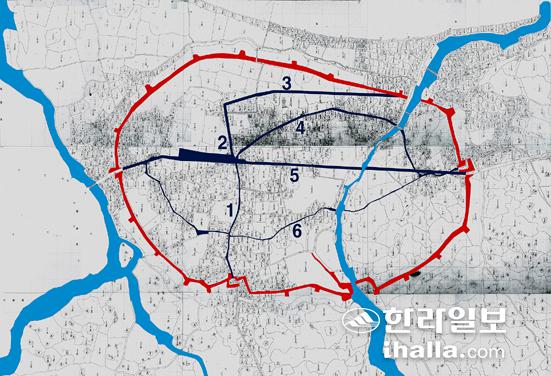 1914년 지적원도를 바탕으로 재현한 제주성 안 주요 옛길. 1이 한짓골, 2가 객사골, 3이 북신작로에 해당되며, 4가 동문에서 칠성통을 거쳐 서문으로 연결하는 북쪽 순환로, 5가 동문에서 서문으로 연결한 도로, 6이 동문에서 구명골~검정목골을 거쳐 서문으로 이어지는 남쪽 순환로에 해당한다.