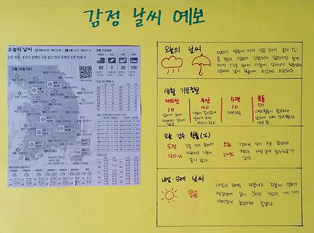 자신의 감정을 일기예보 기호로 표현하고 글을 쓴다. 이때 부모가 같이 활동 하면서 아이의 마음을 이해하도록 하여야 한다.