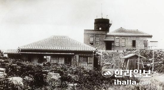 제주지방기상청의 전신인 제주도측후소의 1920년대 모습. 오른쪽에 측후소 건물이 우뚝하게 솟았으며, 왼쪽은 제주측후소 직원이 거처하는 관사 건물이다(사진 '사진으로 보는 제주역사')