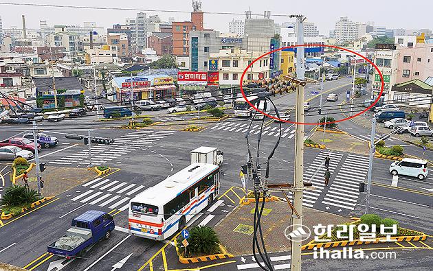 제주시 서문로터리 일대. 붉은 원안이 일제가 1914년 허물어버린 제주성 서문인 진서루가 위치했던 곳이다. 강희만기자