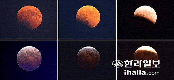 8일 밤 제주시 밤하늘에서 3년 만에 개기월식이 진행됐다. 개기월식은 태양, 지구, 달이 일직선으로 늘어서 달이 지구의 그림자에 완전히 들어가 빛을 잃는 현상으로, 사진 왼쪽 위부터 시계방향으로 시간에 따라 달이 변하는 모습을 촬영했다. 강희만기자