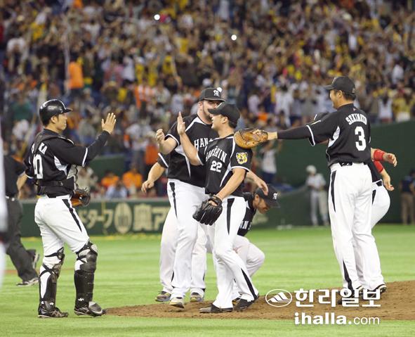 일본 프로야구 한신 타이거스 오승환이 18일 마친 일본 프로야구 센트럴리그 클라이맥스시리즈(CS)에서 최우수선수(MVP)에 뽑혔다. 오승환은 도쿄돔에서 열린 시리즈 요미우리와의 4차전에서 연속타자 홈런을 맞는 등 1이닝 3피안타 2피홈런 2실점으로 다소 부진했지만, 앞서 요미우리와 파이널스테이지에서는 1·2·3차전에 모두 등판해 세이브를 거두고, 4차전에서도 등판해 마지막 승리구를 던졌다. 사진은 이날 경기를 마치며 하이파이브를 하는 오승환(22번) 모습. 연합뉴스