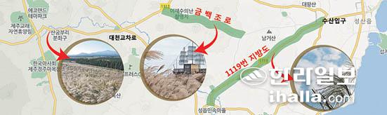 이 가운데 성산읍 수산2리 사거리에서부터 구좌읍 송당리 소재 아부오름 인근 사이의 '금백조로' 구간은 억새 명소로 정평이 나 있다. 금백조로를 즐겨 찾는 이들이 추천하는 팁 하나. '늦은 오후 이후 수산에서 송당 방면으로 지는 해를 마주하라.' 억새들이 '역광(逆光)'을 머금어 마치 한겨울 눈이 내려앉은 듯 하얗게 빛나는 모습을 주워 담을 수 있기 때문이란다. 특히 수산2리 자연생태마을 포토존에서 동쪽 끝을 바라보면 은빛물결 너머 성산일출봉과 우도까지 껴안을 수 있는 특별한 선물을 한 아름 가득 안고 갈 수 있다. 덤으로 주변 오름 중간중간 우뚝 서 있는 풍력발전기가 이색적으로 다가온다.