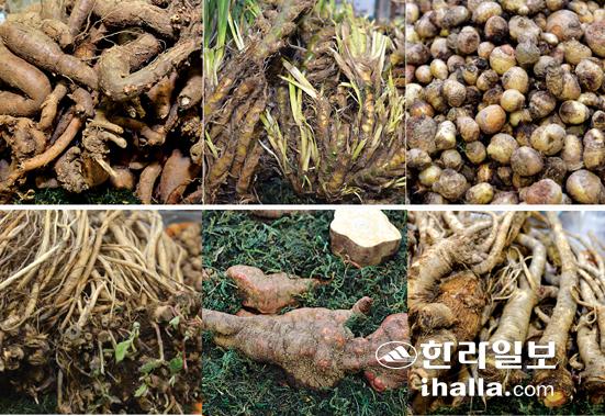 제주도는 아열대성 식물에서부터 아고산대 식물에 이르기까지 식물자원이 풍부해 이를 활용한 약용작물산업 육성에 유리한 여건도 지니고 있다. 사진 왼쪽부터 시계방향으로 약용작물인 백수오·석창포·반하·방풍·하수오·우슬. 사진=한라일보 DB