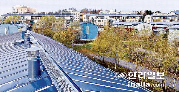 핀란드의 수도 헬싱키에서 약 7㎞ 떨어진 도심 외곽지역에 위치한 에코비키는 지속가능한 친환경 생태주거단지로 조성하기 위해 주택지붕에 태양광시설을 설치하고 건물사이에 녹지공간을 확보했다. 핀란드 에코비키=강희만기자
