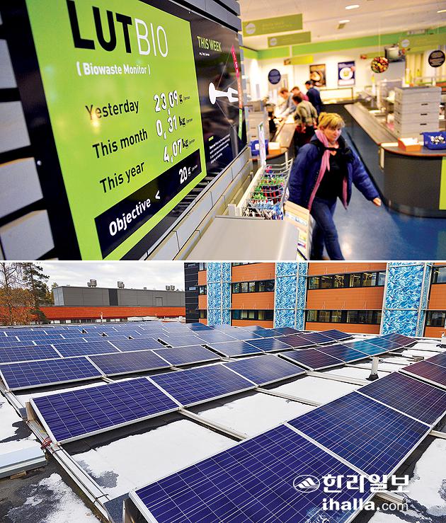 라페란타 공과대학은 구내식당에서 발생하는 음식물 쓰레기 발생량을 매일 공개해 음식물쓰레기 줄이기에 대한 학생들의 관심을 유도하고 있다.(사진 맨 위) 대학건물 옥상에는 220kW급 태양광 발전설비를 구축해 태양광 발전 민간 확산을 도모하고 있다. 핀란드 라페란타시=강희만기자
