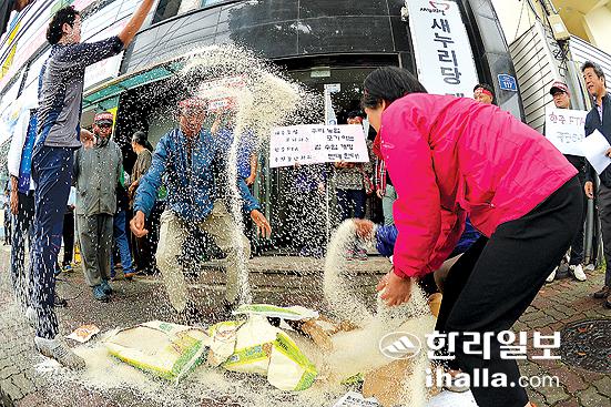 한·중FTA가 타결되자 농민들이 새누리당 제주도당사 앞에서 중국산 쌀을 뿌리며 시위하고 있다. 사진=한라일보 DB