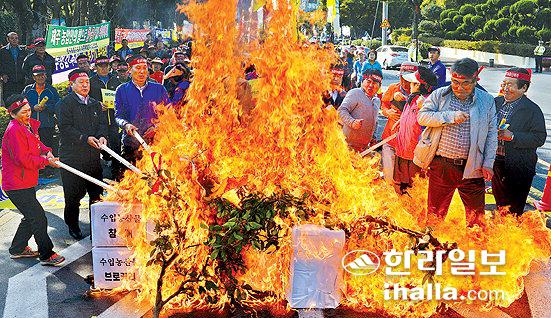 한·중 FTA중단 제주도 1차산업 생산자단체 비상대책위원회는 2014년 10월 24일 제주도청 정문 앞에서 총궐기대회를 열고 막대한 농어업 피해가 예상되는데도 국민적 합의없이 급하게 추진되고 있는 한·중FTA의 협상 중단을 촉구했다. 사진=한라일보 DB