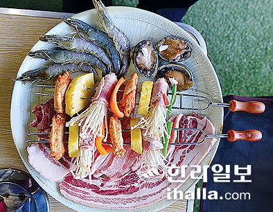 이곳의 주 메뉴는 스페셜모듬이다. 흑목살, 흑오겹살, 항정살과 함께 일반 식당에서는 접하기 힘든 소시지, 과일과 햄 등이 곁들여진 꼬치, 새우 해물구이 등이 포함된다. 성인 3인분 분량으로 100% 제주산 흑돼지만 취급한다. 캠핑용 의자와 테이블에 숯불까지 얹히고 보니 캠핑장에 온 것 같은 기분이다. 구워먹는 파인애플 맛이 시큼하면서도 묘하다.