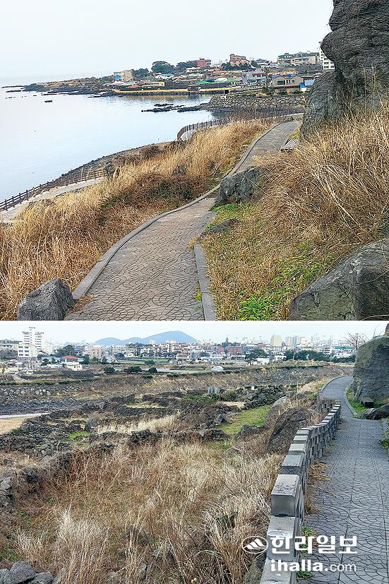 제주시의 명소로 부상하고 있는 별도봉 산책로는 시민뿐 아니라 관광객들에게도 큰 인기를 끌고 있다. 별도봉과 곤을마을을 잇는 올레길(위). 제주4·3의 아픔을 간진한 화북동 곤을마을터(아래). 최태경기자
