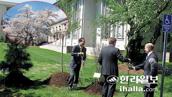 지난 2011년 미국의 수도 워싱턴에 위치한 아메리칸대학교에서 한국정원 기념식수때 당시 한덕수(사진 왼쪽) 주미 한국대사가 대학 관계자들과 기념식수하는 장면. 아메리칸대학교의 한국정원은 1943년 이 대학에 왕벚나무 네그루를 식재한 것이 인연이 돼 조성됐다. 왼쪽 원안 사진은 당시 이승만 박사가 심은 왕벚나무의 만개한 모습. 사진=한라일보 DB