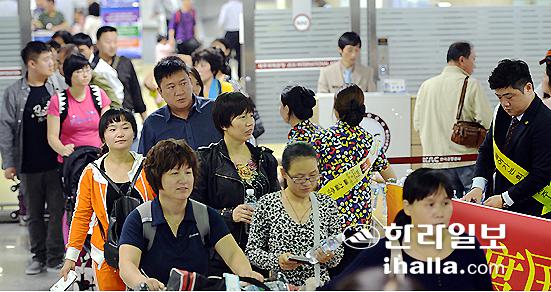 지난해 10월 중국 국경일에 제주를 찾은 중국인 관광객들이 제주공항을 통해 입국하고 있다. 사진=한라일보 DB