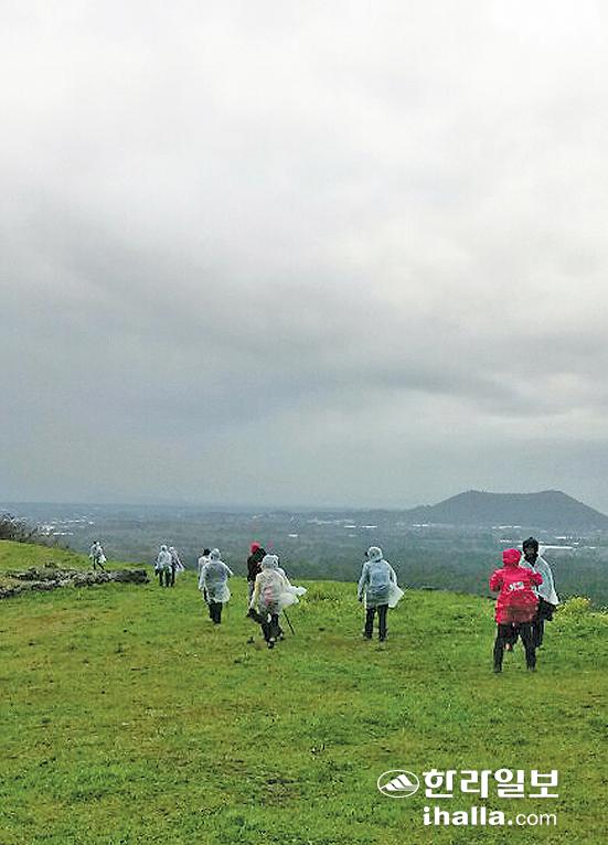첫번째 들어선 방목지에서는 정면에 한경면 저지오름이 바라다보이고, 오른쪽으로는 한림읍 느지리오름과 금악오름이 한라산을 향해 뻗은 모습을 감상할 수 있었다. 약 40분쯤 방목지와 곶자왈, 다시 방목지를 걸어 문도지오름에 도착했다. 문도지오름은 곶자왈에 둘러쌓여 있는 오름으로 죽은 돼지 형상에서 오름 명칭이 유래했다는 이야기가 전해진다. 오름 정상에 오를 즈음 비바람이 더욱 거세졌지만 정상에서 북서사면 기슭으로 몸을 옮기니 바람을 피할 수 있었다.