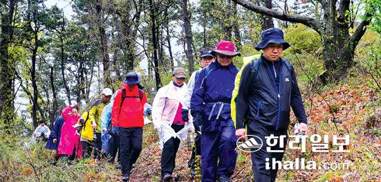길잡이로 나선 이권성 제주트래킹연구소장도 트래킹코스를 설명하면서 당부했다. "오늘 탐방하게 되는 곶자왈 지대는 봄이 지나면 풀과 나무가 우거져서 늦가을이나 돼야 다시 진입할 수 있기 때문에 첫 코스로 잡았습니다. 트래킹 도중 만나게 되는 고사리와 달래를 캐는 건 괜찮지만 새우난초 등 보호종은 절대 손에 대서는 안됩니다."