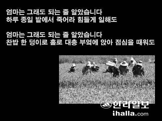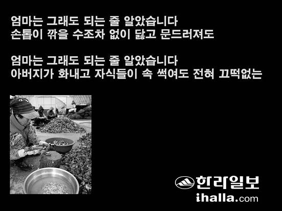 앓을 사 그릇될 사 자식 생각에 고우시던 이마 위엔 주름이 가득