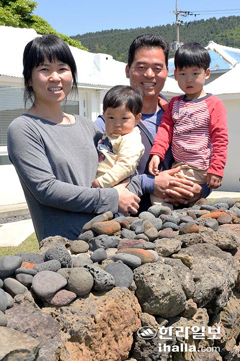 4년 전 제주시 구좌읍 종달리에 정착한 김문재, 정희정 부부가 두 자녀 창규, 이주와 함께 환히 웃고 있다. 강경민기자