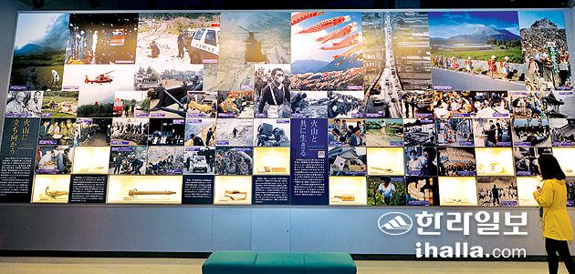 운젠다케 재해기념관에 전시돼 있는 대형 사진. 1990~1996년 운젠 화산을 대표하는 후겐다케 분화 당시 피해를 극복해 나가는 사람들의 모습이 담겼다. 강경민기자