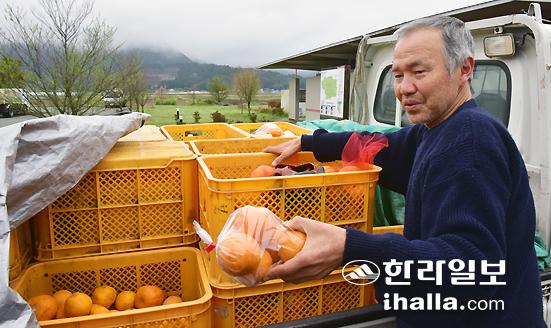 지역 농민=아소시에 있는 직판장 중 한 곳인 '시키사이(사계채)'를 통해 농산물을 판매하는 지역 주민이 자신이 재배하고 포장한 귤을 보여주고 있다.