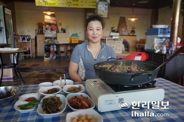 주인장 장순화씨가 보양식 옻오리 요리를 소개하고 있다.