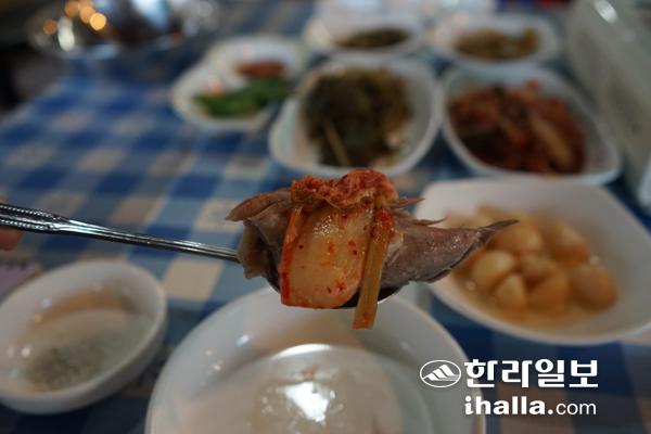김치, 양파지, 마늘지, 명이나물 등 반찬이 나오자 곧바로 오리고기와 김치를 곁들여 먹었다. 잘 익은 오리의 부드럽고 쫀득한 식감과 김치가 만나면서 환상의 궁합이 입안에서 펼쳐졌다. 세련된 맛은 아니지만 제주도 말로 표현하면 배지근한(적당히 기름지고 감칠맛이 나는) 맛이 느껴졌다. 오리고기를 다 먹었다면 무료로 찹쌀 누룽지나 면 사리를 선택해 육수와 함께 먹을 수 있다.