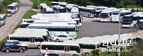 '메르스'로 인해 가장 큰 피해를 보고 있는 곳은 전세버스업체다. 제주도관광협회 조사 결과 가동률이 1%에 불과한 곳도 있으며, 기껏해야 10% 정도에 머물러 업계 전체가 고사 위기에 내몰렸다. 사진은 메르스 여파로 발 묶인 전세버스. 강희만기자
