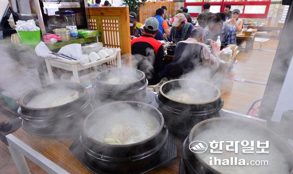 낮 최고기온이 33℃까지 치솟으며 무더운 날씨를 보인 13일 제주시내 한 음식점에서는 몰려드는 손님들에게 여름 보양식인 삼계탕을 내놓느라 분주한 모습이다. 강희만기자
