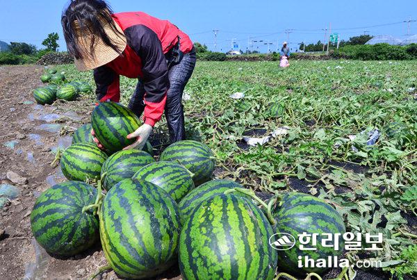 제9호 태풍 '찬홈'이 제주지방을 지난후 무더운 날씨를 보인 13일 제주시 애월읍 구엄리에서 농민들이 맛있게 잘 익은 노지수박을 수확하느라 구슬땀을 흘리고 있다. 강희만기자