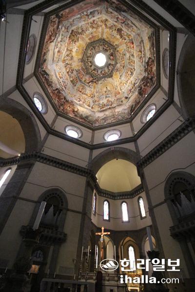 두오모 성당 내부. 상부는 가톨릭에서 좋은 의미로 받아들이는 팔각형 모양이고 위에서 아래를 내려다봤을 때는 십자가(라틴 크로스 형태)모양으로 되어 있다. 이 때문에 4개 방향에서 미사를 할 수 있다.