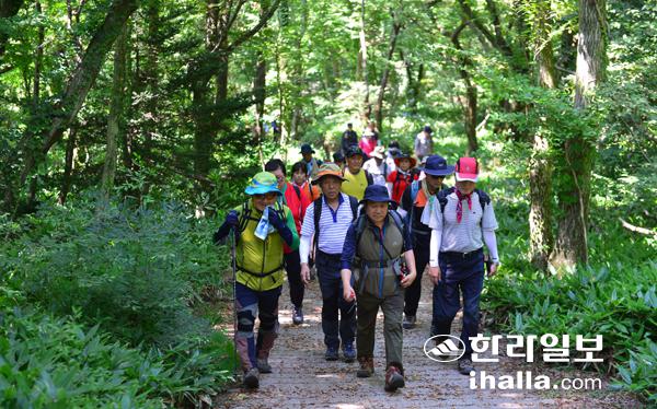 영실입구~민모루오름~한라산둘레길~18림반으로 연결되는 코스는 대부분 평탄하게 이어진다. 사진은 탐방객들이 녹음이 우거진 코스를 걷고 있다. 강희만기자