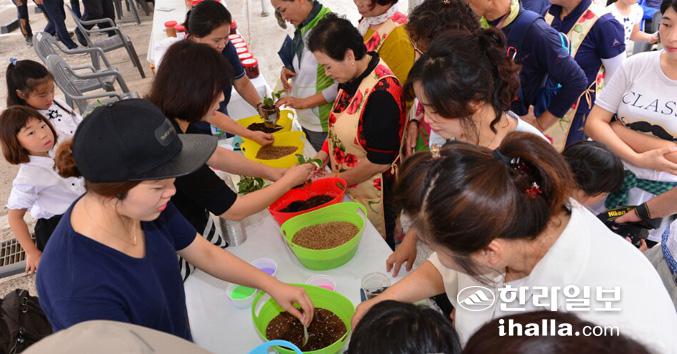 아시아기후변화교육센터에서의 기후변화 이동체험 한마당과 한경면 농가주부모임과 부녀회, 생활개선회가 먹거리 장터는 물론 지역특산품 판매장을 운영하며 탐방객의 발길을 끌어 모우고 있다.