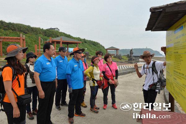 무등산권 국가지질공원 광주지역 해설사와 관계자들이 31일 수월봉 지질공원 트레일 행사장을 찾았다. 방문단은 이날 전용문(맨 오른쪽) 박사의 안내로 수월봉 트레일 코스를 둘러보며 지질공원 활용 사례를 살폈다. 강경민기자