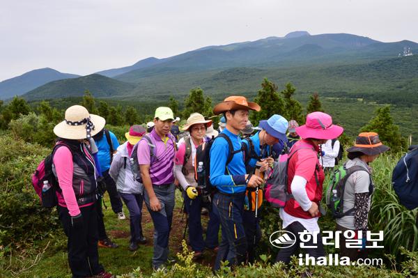 이번 코스의 매력은 하천 옆길을 따라가는 터라 곳곳에서 오아시스를 만난다는 것이다. 오전 8시 코스에 발을 들여놓고 오르고 내림을 반복하면서 몸이 지칠때쯤 보물을 만났다. 보석처럼 빛나는 맑은물을 담고 있는 이름모를 연못이 일행을 반긴다. 많은 일행들이 "이쁘다"며 사진을 찍어대고 일부는 얼굴을 적신다. 길잡이들이 다시 발길을 재촉한다. 비슷한 모양을 한 숲길이 이어져 지루해질 쯤 또한번 진미를 경험했다. 큰노루오름이다. 보다 정확하게 표현하면 오름정상에서 바라보는 제주섬의 전경은 환상적이다. 10분 남짓 헉헉 거렸지만 보람이 있다. 한라산 꼭대기가 손에 잡힐 듯 왼쪽에 버티고 있고 그 주변 풍광이 파노라마처럼 펼쳐지는게 그야말로 장관이다.