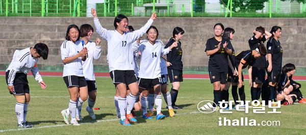 고등 클럽부 결승전에서 영주고와 전후반 2-2로 비긴 뒤 승부차기에서 3-2로 이기며 우승을 확정지은 중앙여고 선수들이 기뻐하고 있다. 강희만기자