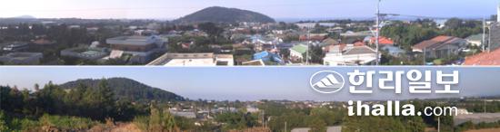 마을회관 옥상에서 수산봉 방향으로 바라본 마을전경(위)과 당동네와 수산봉 주변 풍경(아래).