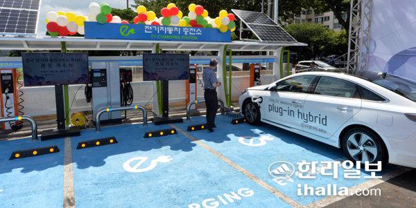 전기차 보급이 확대되면서 관련 산업으로 발을 넓히려는 민간 움직임이 일고 있다. 사진은 지난 7월 문을 연 전기자동차 충전소. 사진=한라일보 DB