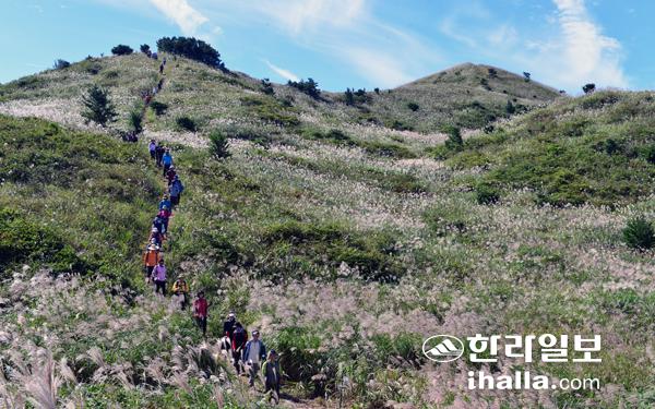 오름의 여왕이라 불리는 따라비오름으로 이어지는 길은 익어가는 가을을 보여주듯 억새가 탐방객들의 눈을 즐겁게 했다. 강희만기자