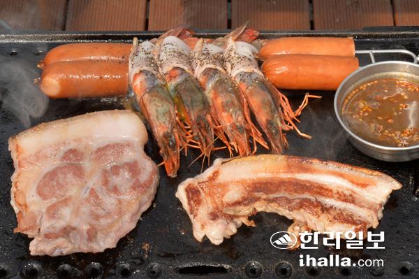 주인장이 직접 제작한 주물형 구이판에 흑돼지와 새우, 소시지 등이 맛있게 구워지고 있다.